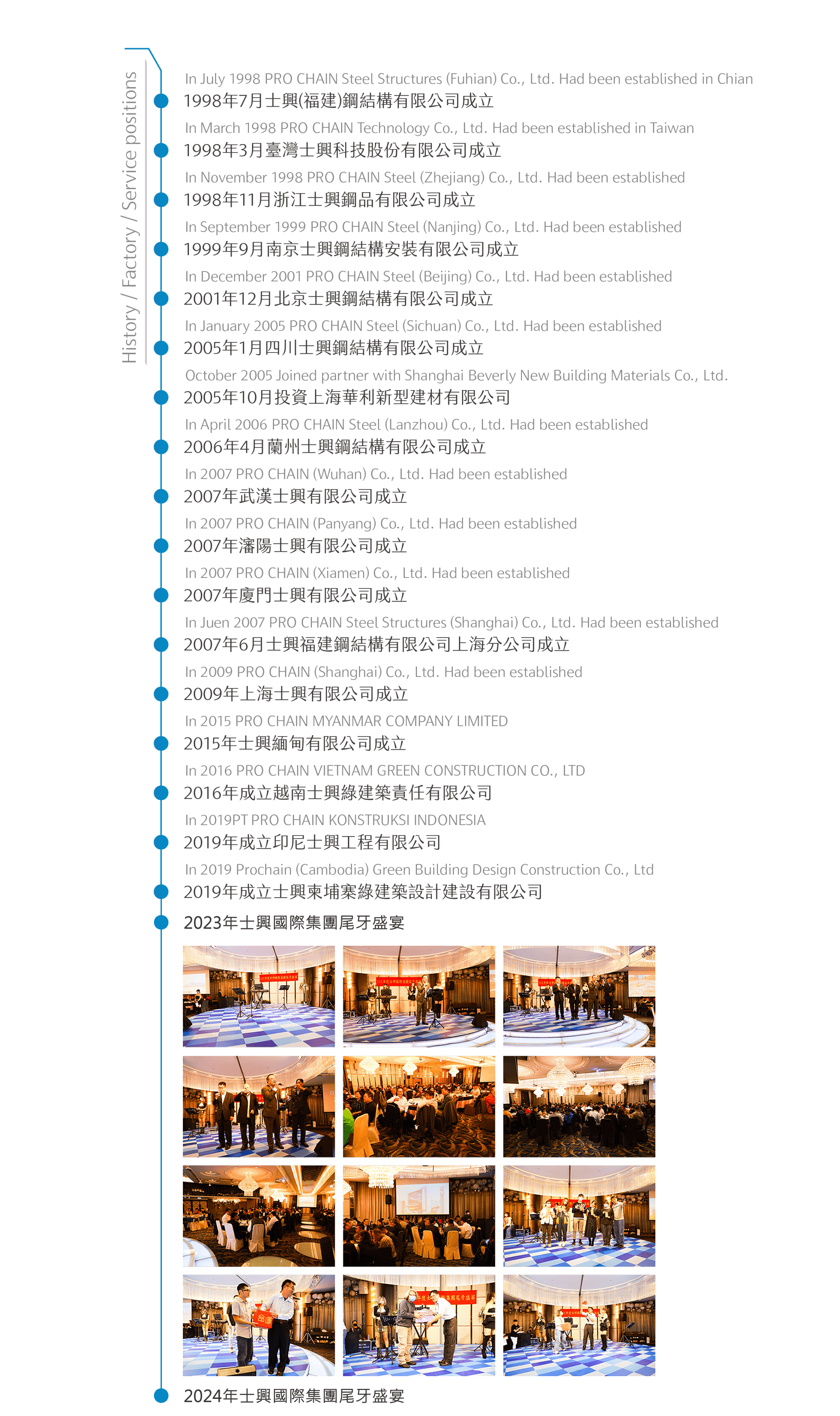 HOME 公司介紹 關於我們 關於我們 士興科技股份有限公司成立於1998年,提供專業的鋼結構廠房整體規劃、工程設計、製造及安裝服務。由臺灣逢甲大學土木系畢的四位校友共同設立,並由吳清綠主席及魏潮文顧問共同指導。 經過一番內部創業,至今為擁有二十幾家分公司的企業集團,據點遍佈中國大陸、台灣及東南亞。 集團更創立世界華人品牌-士興綠建,工程設計注重環保節能,並基於取之於社會、用之於社會的道理,努力善盡社會責任。 除關注環境永續以外,集團亦鼓勵內部創業,給有想法的年輕人一個創業的舞台。