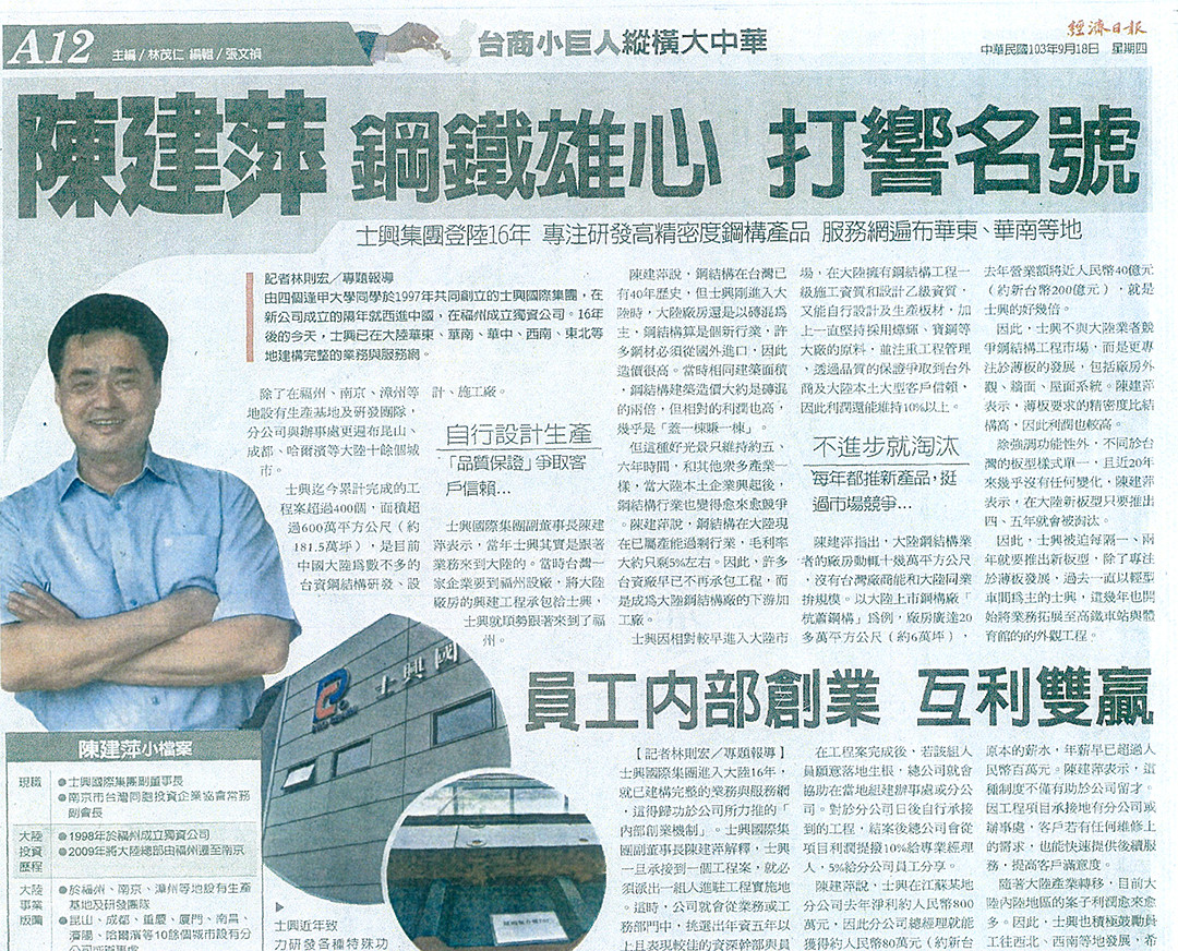 由四個逢甲大學同學於1997年共同創立的士興國際集團,在新公司成立的隔年就西進中國,在福州成立獨資公司,目前已在大陸華東、華南、華中、西南、東北等地建構完整的業務與服務網。公司在大陸擁有鋼結構工程一級施工資質和設計乙級資質,又能自行設計及生產板材,加上一直堅持採用燁輝、寶鋼等大廠的原料,並注重工程管理;鋼結構工程市場部分則是專注於薄板的發展,且被迫每隔一、兩年就要推出新板型;士興一旦承接到一個工程案,就必須派出一組人進駐工程實施地,這也是公司所力推的「內部創業機制」。由於上述三大策略,使士興成為目前中國大陸為數不多的台資鋼結構研發、設計、施工廠,利潤都能維持在10%以上。